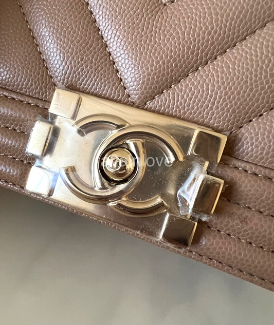 CHANEL Dark Beige Caviar Chevron Microchipped Small Boy Flap Bag Light Gold Hardware