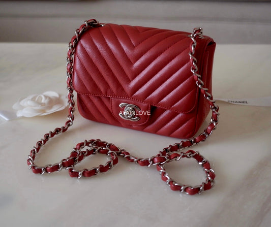 CHANEL 16S Dark Red Caviar Chevron Classic Square Mini Flap Bag Silver Hardware