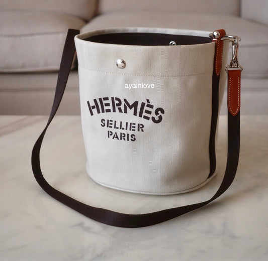 HERMES Sac de Pansage Toile Chevron Craie Gold Bucket Grooming Bag Palladium Hardware