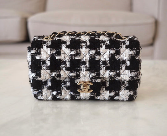 CHANEL 20S Black Ecru Houndstooth Tweed Rectangular Mini Flap Bag Light Gold Hardware