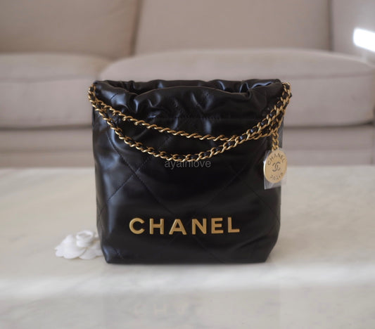 CHANEL 23S Mini 22 Black Shiny Calf Skin Bag Gold Hardware