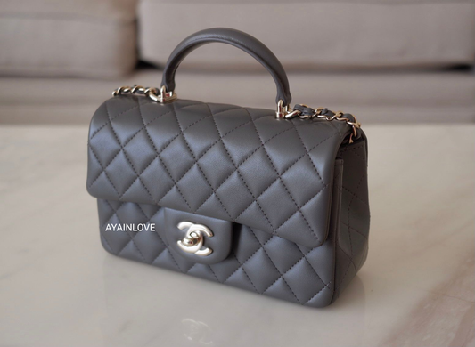 CHANEL 22A Grey Lambskin Top Handle Rectangle Mini Light Gold Hardware