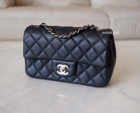 CHANEL 15C Pearly Black Charcoal Caviar Rectangular Mini Silver Hardware