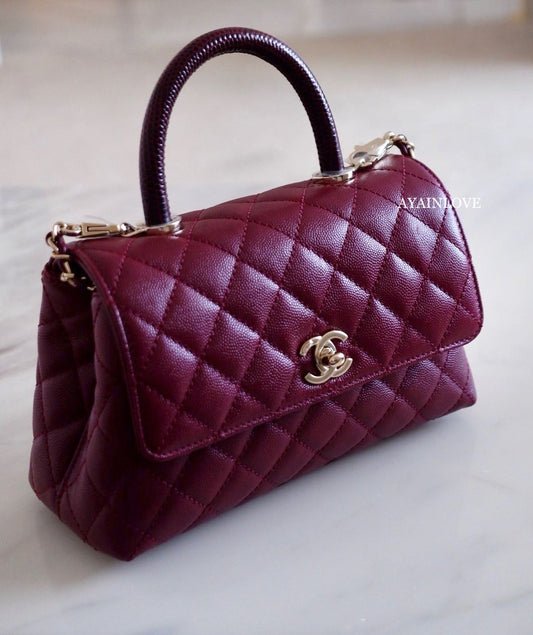 BURGUNDY CAVIAR COCO HANDLE SMALL OLD MINI 24 cm LIGHT GOLD HARDWARE *NEW*