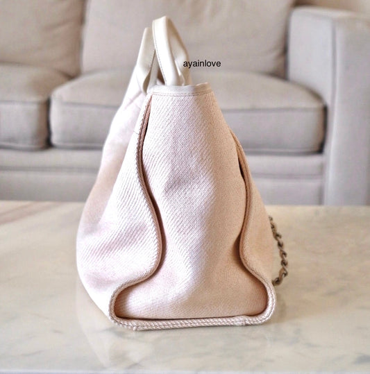 CHANEL Beige Pink Large Deauville Canvas Calf Skin Handle Silver Hardware