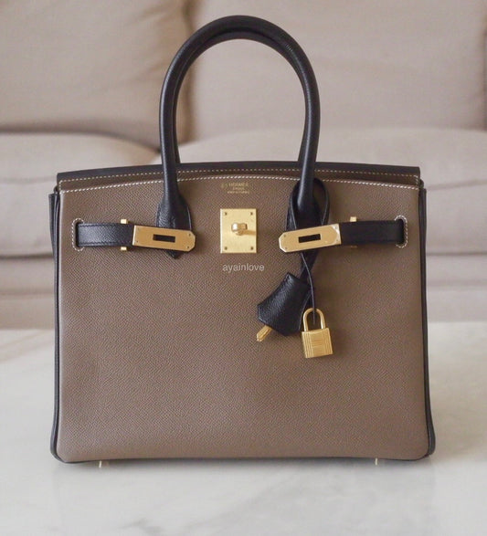 HERMES Birkin 30 HSS Horseshoe Stamp Special Order Bicolour Etoupe and Noir Epsom Brushed Gold Hardware