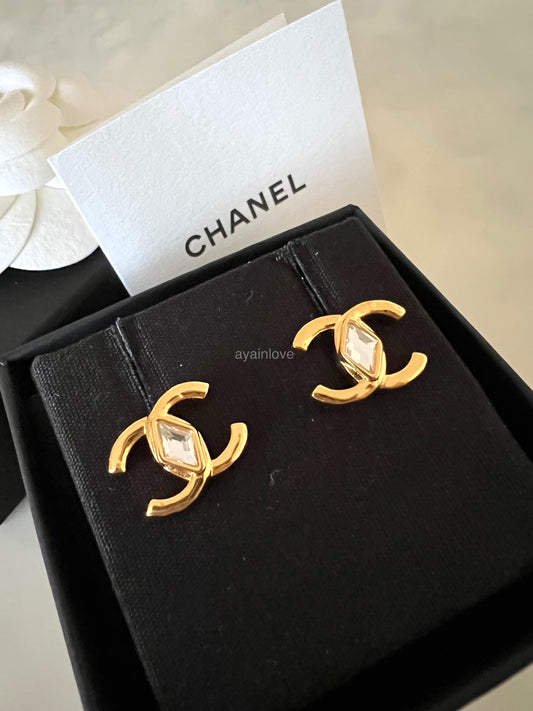 CHANEL 23C Gold Crystal CC Stud Earrings