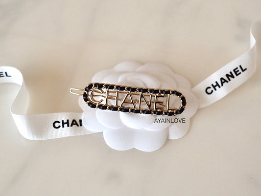 Script Hair Barrette Clip In Black Interwoven Chain Leather Light Gold Hardware