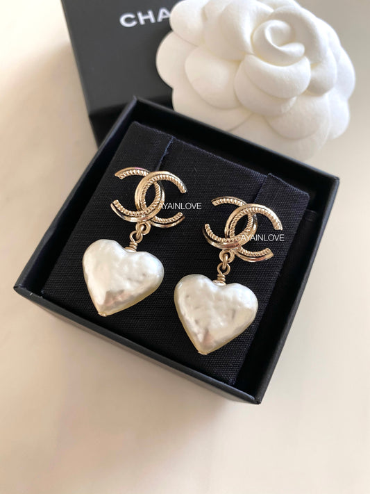 CHANEL 22C Heart Pearl Drop Earrings Light Gold Hardware
