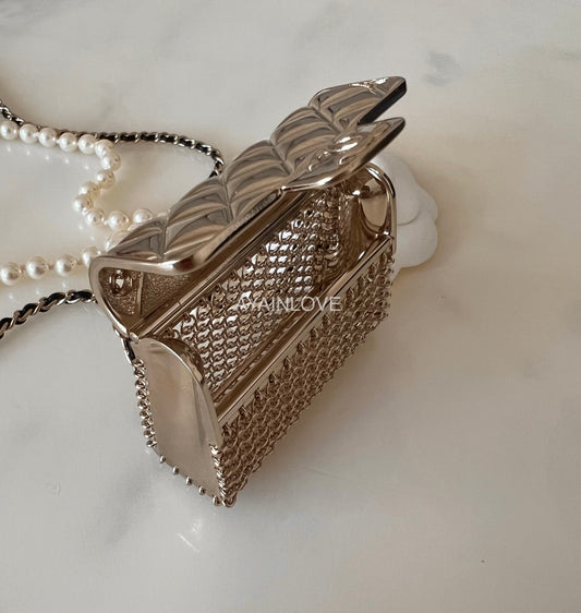 CHANEL 21S Flap Bag Charm Pearl Leather Strap Long Necklace Light Gold Hardware