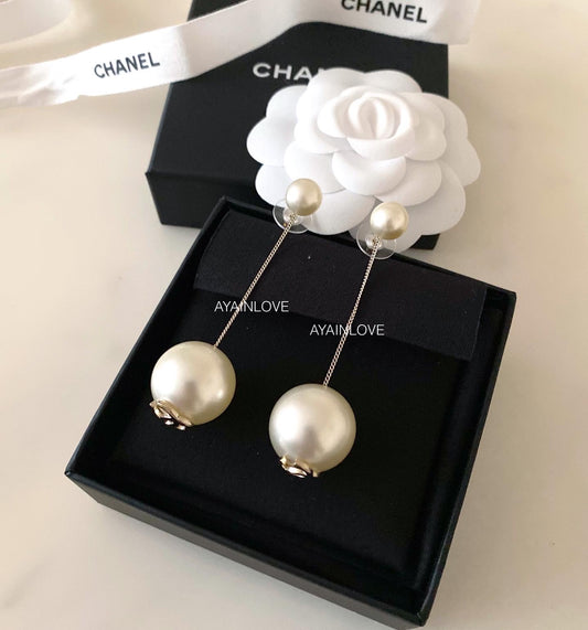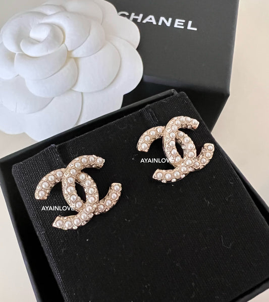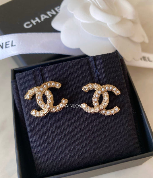 20B Black Crystal White Pearl Large CC Stud Earrings Light Gold Hardware