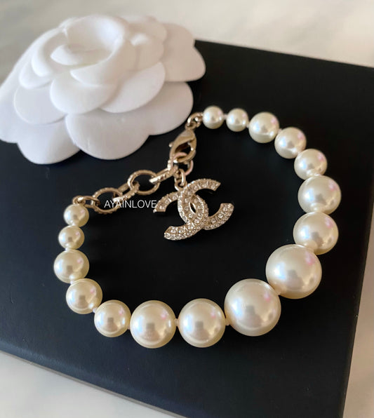 CLASSIC PEARL BRACELET CRYSTAL CC CHARM LIGHT GOLD HARDWARE *NEW*