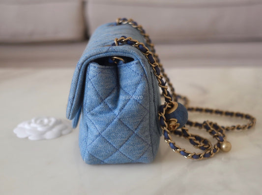 CHANEL 22C Blue Denim Pearl Crush Square Mini Flap Bag Gold Hardware