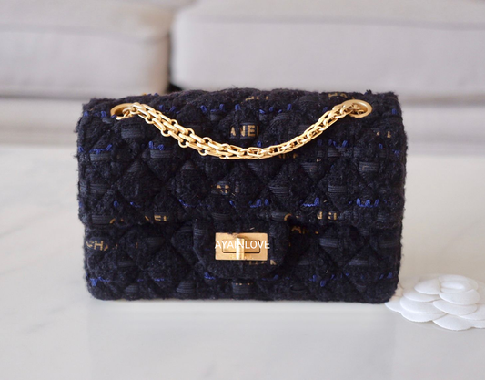 CHANEL 20K Black Navy Ribbon Tweed 2.55 Reissue Mini Gold Hardware