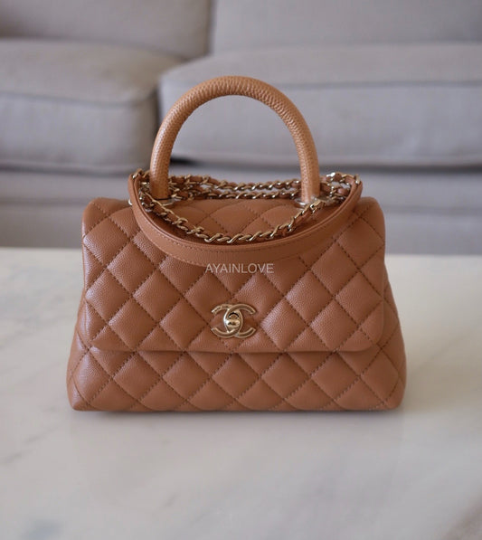 CHANEL 21P Caramel Brown Caviar Small Coco Handle 24 cm Light Gold Hardware
