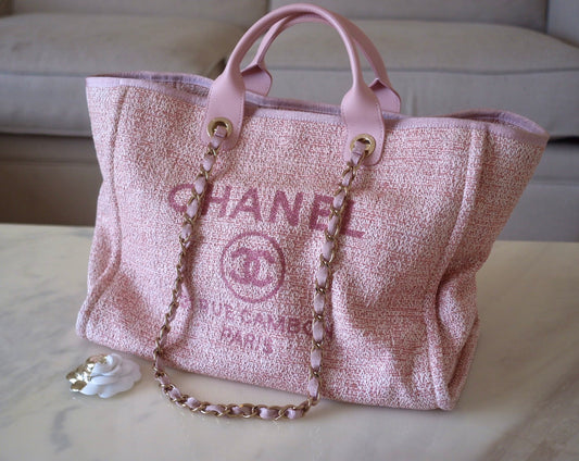 CHANEL 19C Pink Canvas Glitter Medium 38cm Deauville with Pink Calf skin Handle Light Gold Hardware