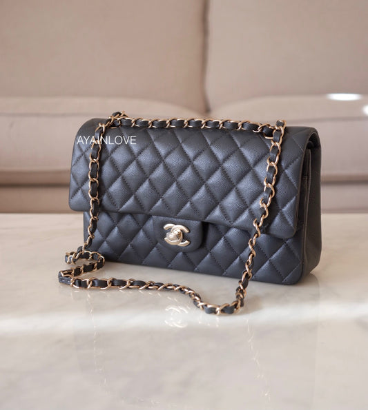 CHANEL 21B Dark Grey Medium Classic Flap Bag Light Gold Hardware