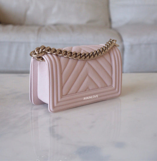 CHANEL 20A Beige Pink Caviar Small Chevron Leboy Flap Bag Light Gold Hardware