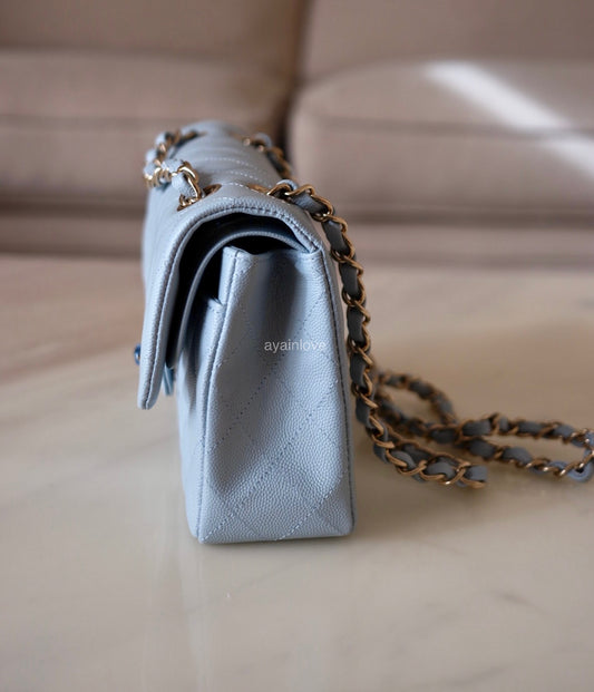 CHANEL 22P Light Blue Caviar *Microchipped* Small Classic Flap Light Gold Hardware