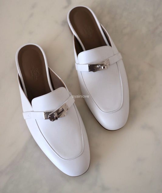 HERMES White Blanc Calfskin Oz Mules Loafers Shoes Palladium Hardware Size 38