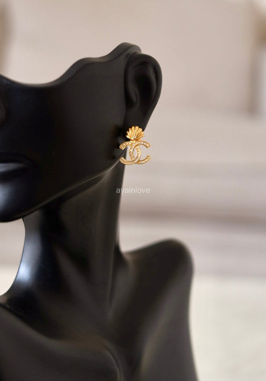 CHANEL 23C Seashell CC Crystal Stud Earrings Gold Hardware