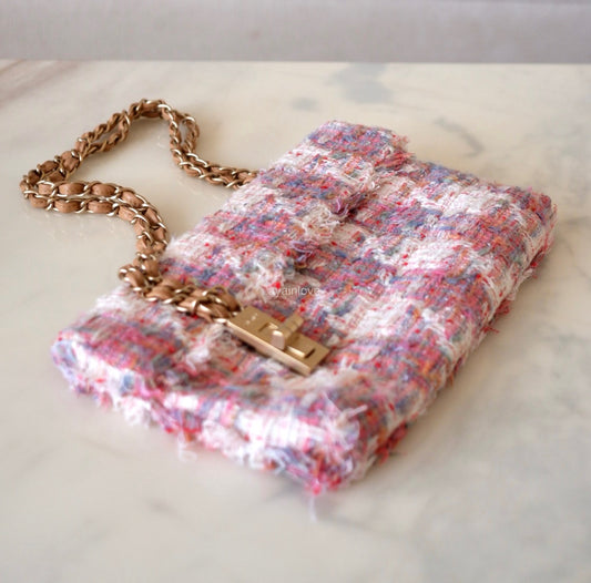 CHANEL 04P Pink White Multicolour Tweed Vintage Flap Clutch Bag Brushed Gold Hardware
