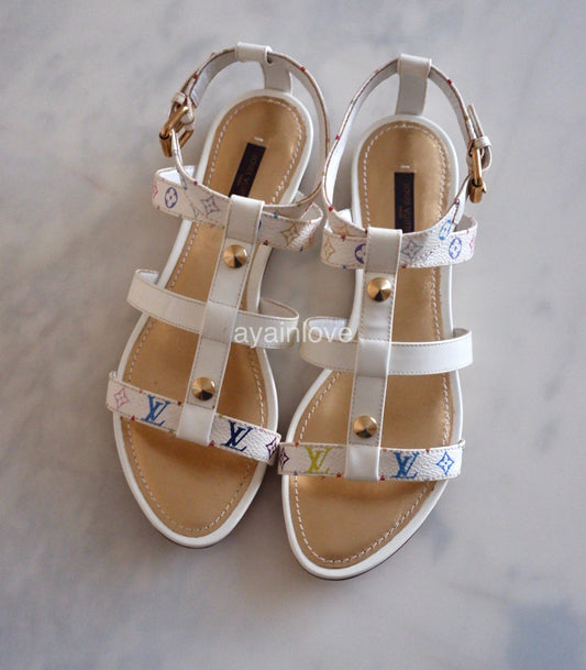 LOUIS VUITTON White Multicolour Murakami Ankle Sandal Strap Gold Hardware Sz 37