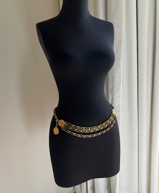 CHANEL Vintage Black Triple Leather Chain Medallion CC Belt 24KT Gold Plated Hardware