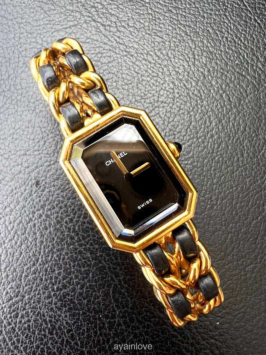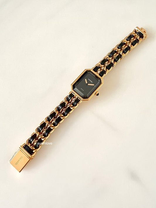 CHANEL 1987 Vintage PREMIERE Watch Black Leather and 24KT Yellow Gold Plated M Size