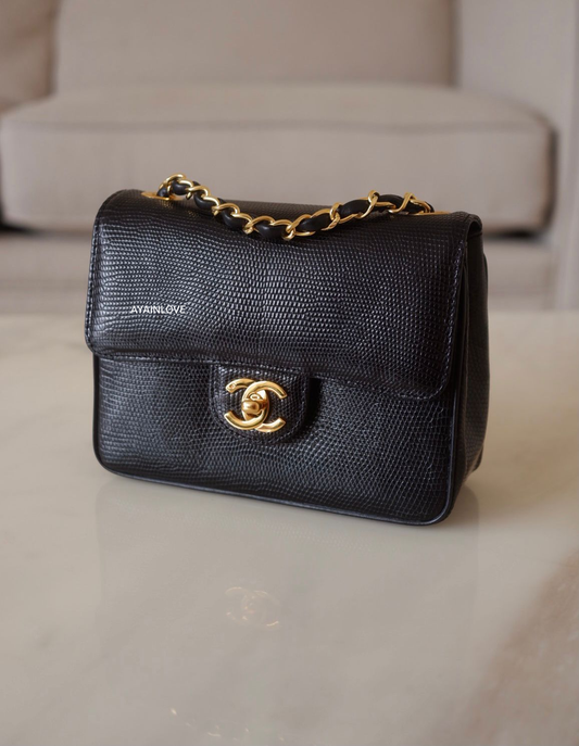 CHANEL Vintage Black Lizard Mini Bag Circa 1989-1991 24K Gold Plated Hardware Series 1