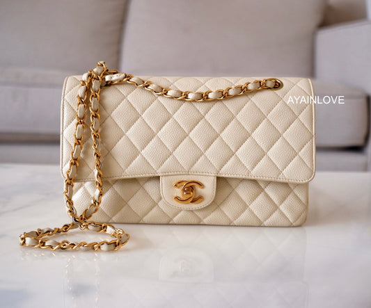 CHANEL Vintage Light Beige Caviar Medium Classic Flap 24K Gold Plated Hardware Series 5