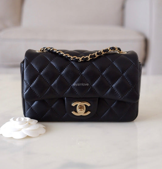 CHANEL 24K Black Lambskin Classic Rectangular Extra Mini 18cm Flap Light Gold Hardware