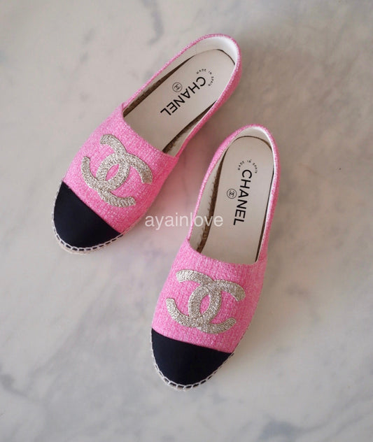 CHANEL Pink Gold Tweed Espadrilles Shoes Size 38 EU