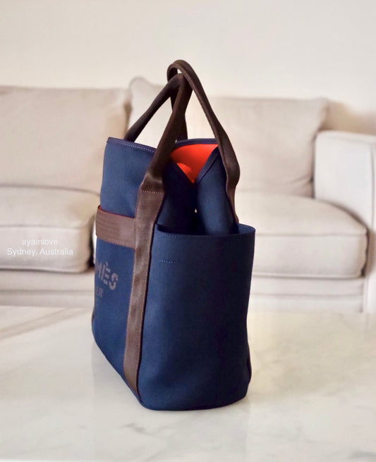HERMES Grooming Canvas Navy Blue Brown Orange Bag Palladium Hardware D Stamp