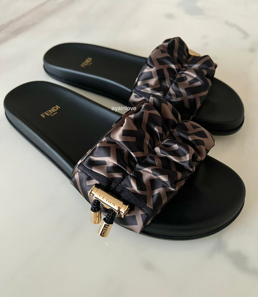 FENDI Feel Satin Brown FF Monogram Slides Sandals Size 38