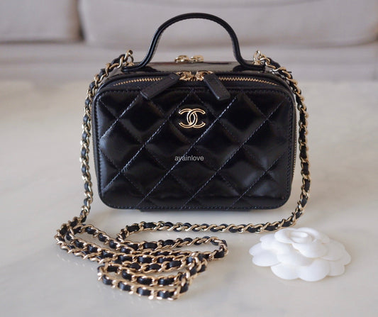 CHANEL Black Patent Quilted Calfskin Mini Vanity Bag on Chain Light Gold Hardware
