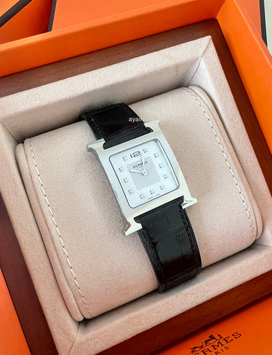 HERMES Heure Medium 30 mm Diamonds Dial Watch Alligator Black Strap