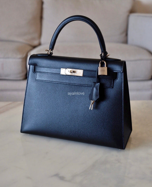 HERMES Kelly 28 Black Noir Epsom Sellier Palladium Hardware C Stamp