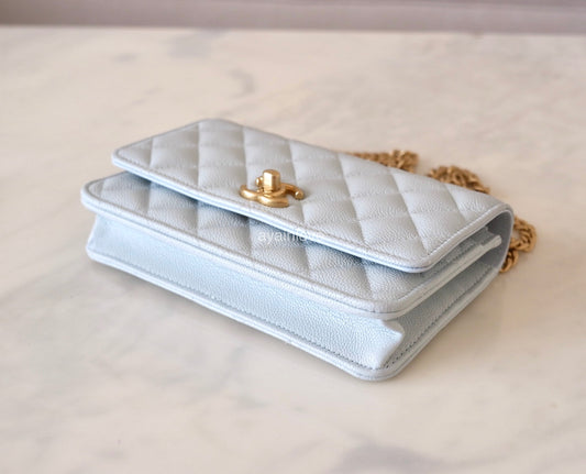 CHANEL 24P Sweetheart Light Blue Caviar Wallet on Chain Brushed Gold Hardware