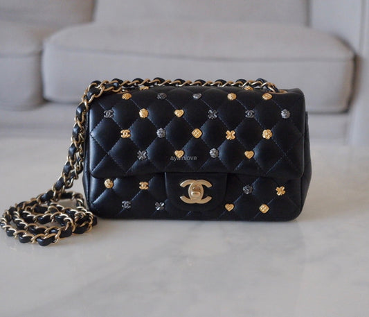 CHANEL 18K Black Lucky Charm Lambskin Rectangular Mini Flap Bag Brushed Gold Hardware