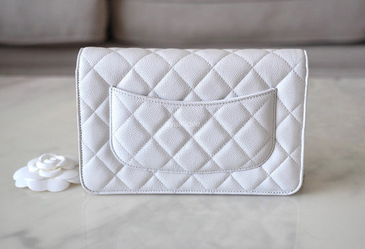 CHANEL 23K White Caviar Classic Wallet On Chain Light Gold Hardware
