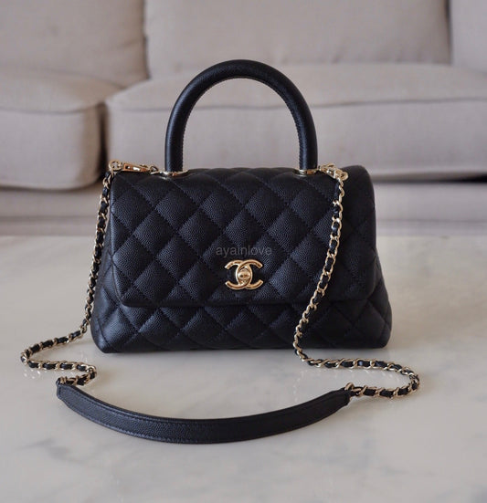 CHANEL Black Caviar Quilted Small Coco Handle 24 cm Light Gold Hardware