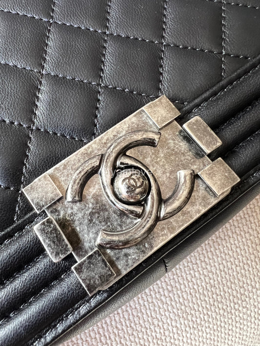 CHANEL Black Lambskin Quilted Old Medium Boy Flap Bag Ruthenium Hardware