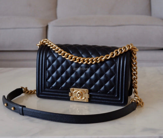CHANEL Black Caviar Quilted Old Medium Boy Flap Bag Brushed Gold Hardware