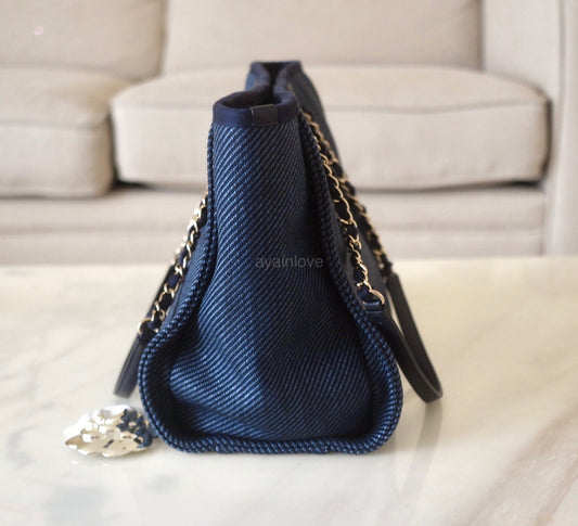 CHANEL Navy Blue Canvas Glitter Small Medium Deauville Tote Bag Light Gold Hardware