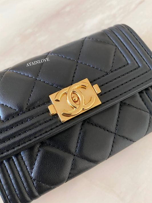 BLACK LAMB SKIN BOY FLAP CARD HOLDER LIGHT GOLD HARDWARE