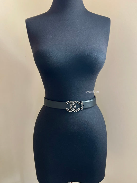 CHANEL Black CC Leather Chain Belt Size 75 Silver Hardware