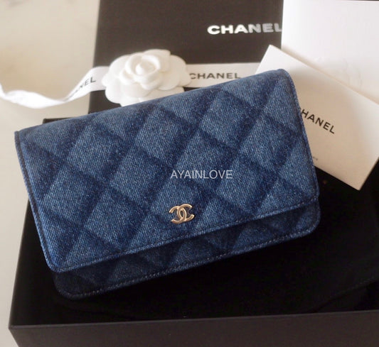 Chanel 22B Blue Denim Classic Wallet On Chain Light Gold Hardware *New*