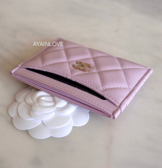 21S ROSE CLAIR LILAC PINK CAVIAR FLAT CARD HOLDER LIGHT GOLD HARDWARE
