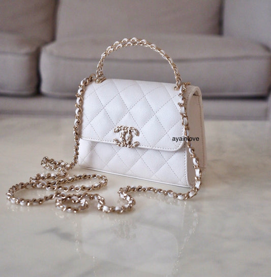 CHANEL 23P White Caviar Kelly Clutch Top Handle with Chain Light Gold Hardware
